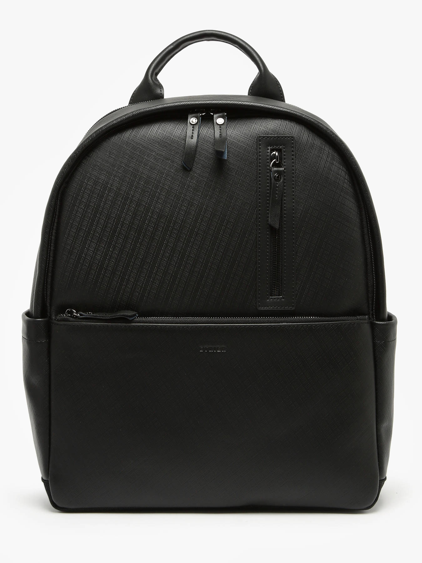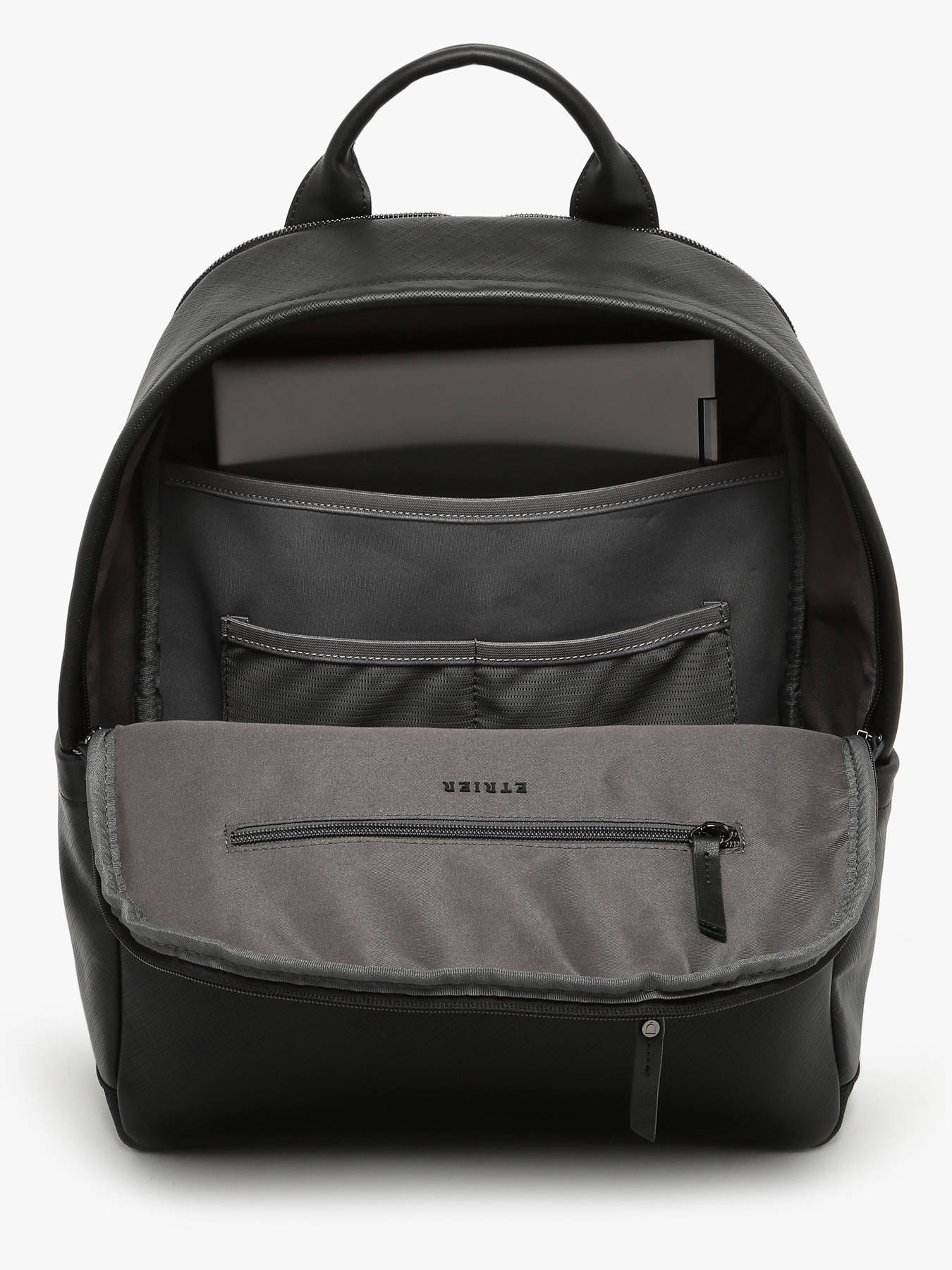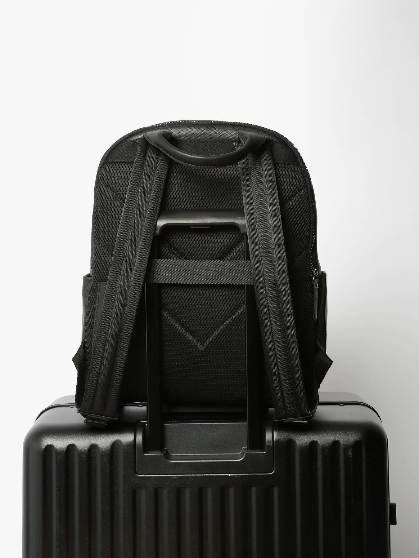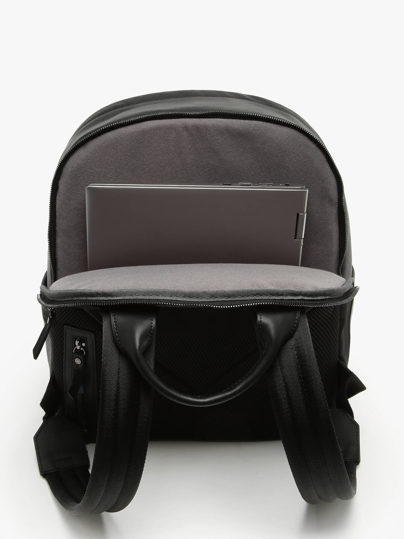This business backpack from the Flèche line, made of textured leather, combines elegance and functionality. It features a telescopic handle pass-through, two front pockets, one back pocket, and two side pockets for optimal storage. Inside, it is divided into two compartments, with three simple pockets, one quick-access pocket, and a reinforced compartment for a 15"" laptop.