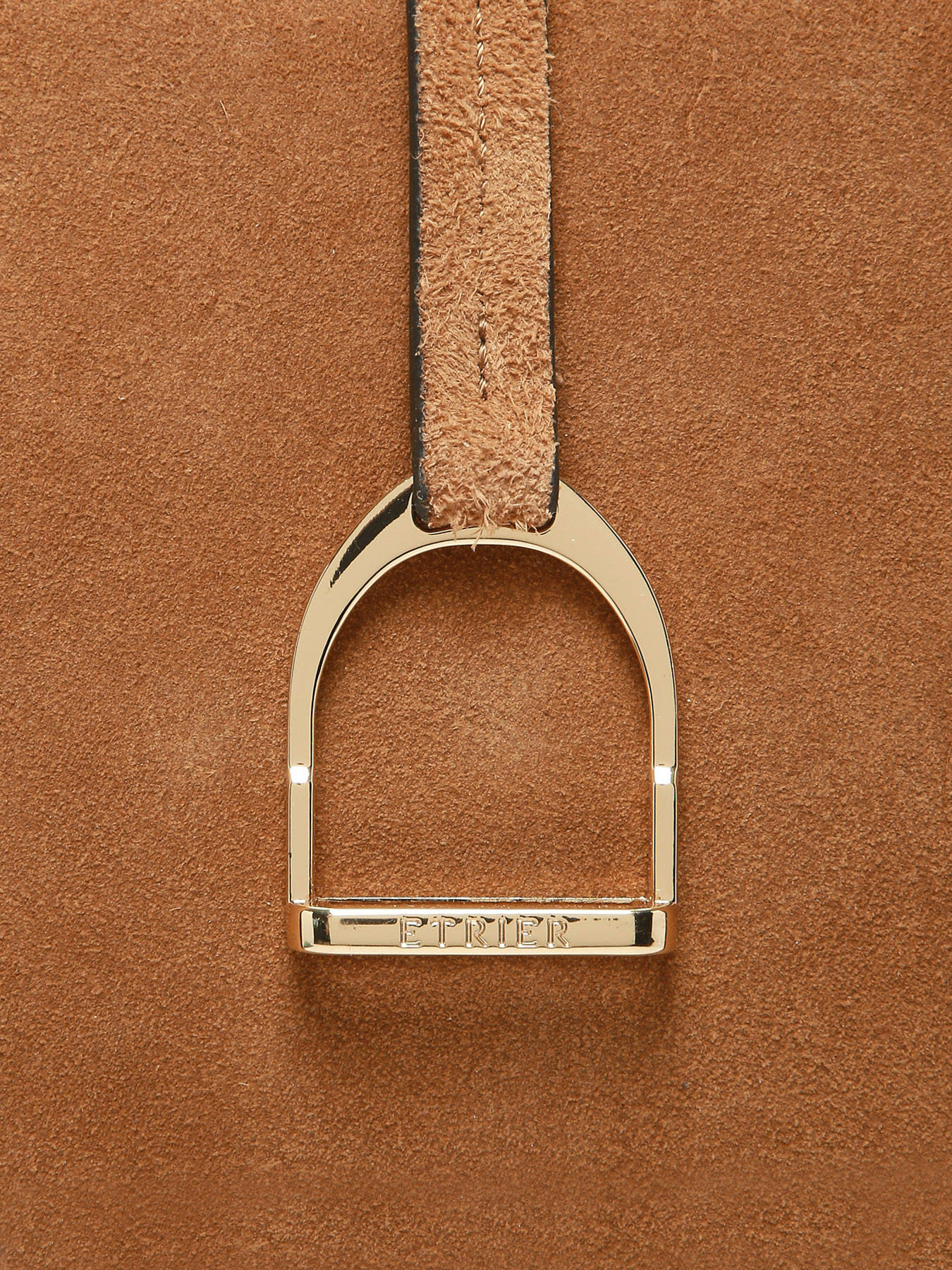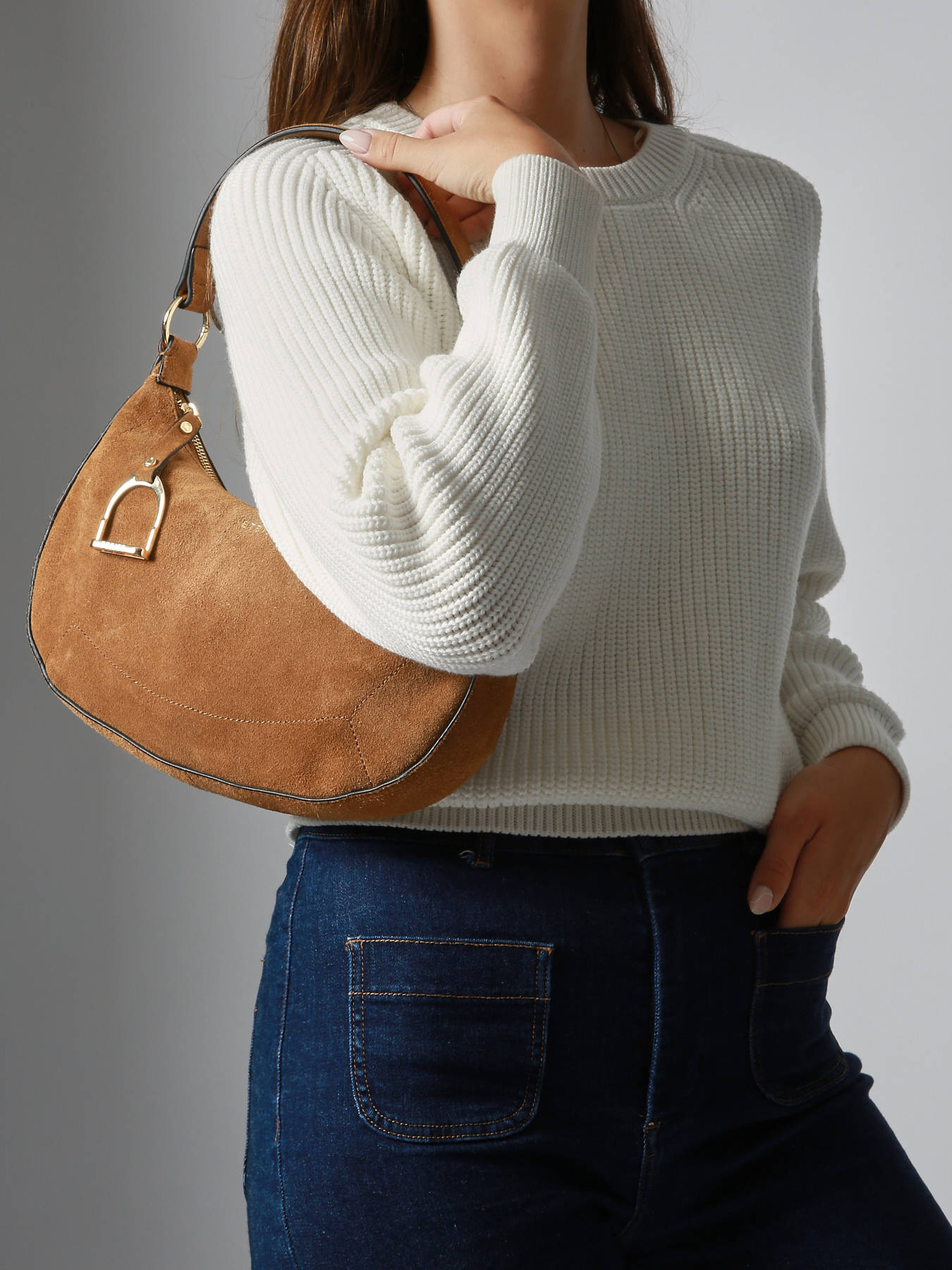 The ETRIER shoulder bag from the ALTESSE SUEDE line is crafted from velvety leather with a soft, warm feel. This half-moon shaped model is both trendy and elegant. It can be worn on the shoulder or as a crossbody thanks to its removable and adjustable strap. The brand’s iconic stirrup — here in a gold finish — adorns the zipper pull, adding a refined touch to the design. The back of the bag features grained leather for added contrast and enhanced durability. Inside, the bag offers two slip pockets and one zipped pocket for optimal organization. The ALTESSE SUEDE line reinvents the House’s iconic piece by infusing it with a ""Highlander Cowboy"" spirit — a subtle blend of timeless elegance and contemporary boldness.