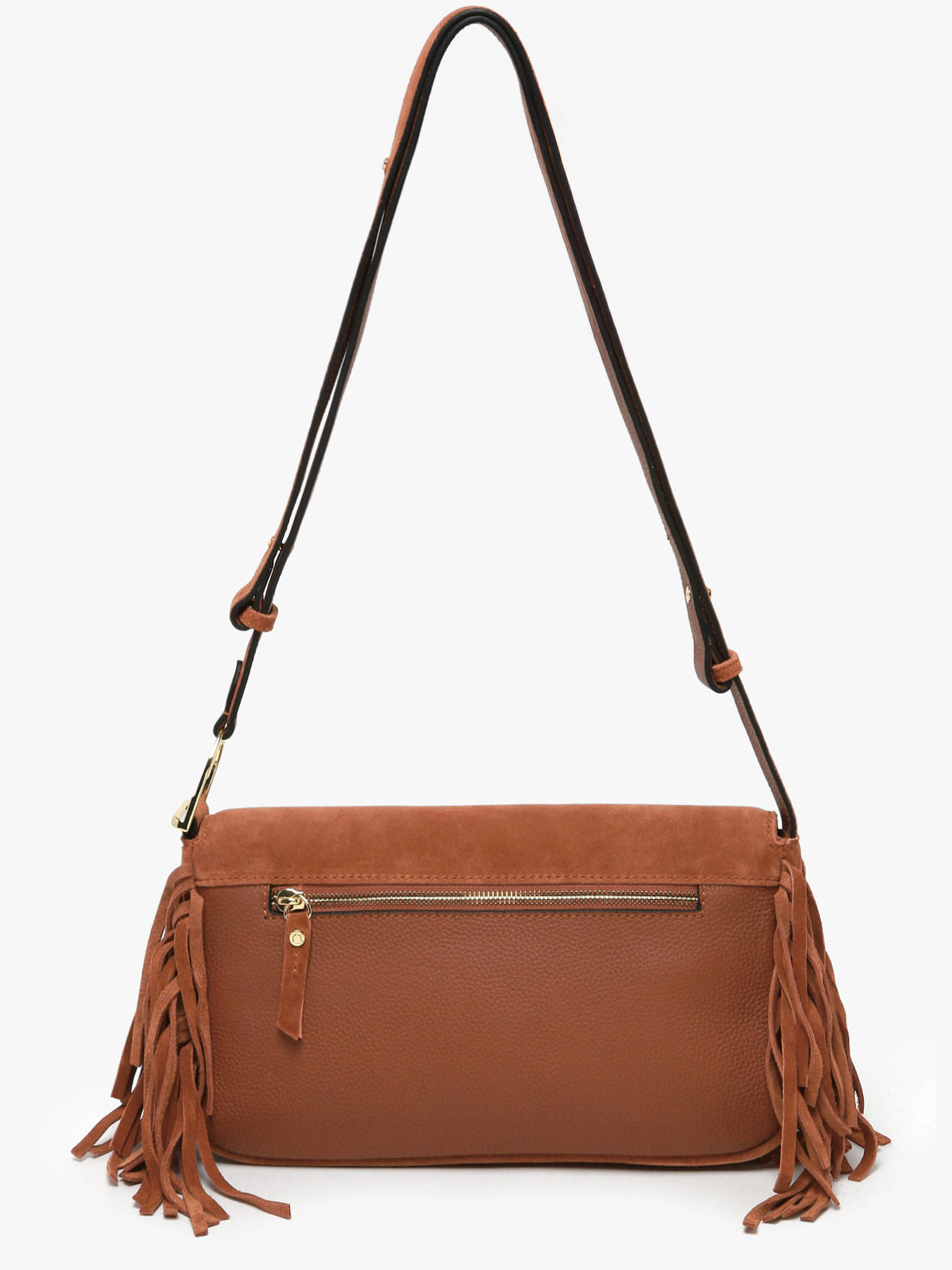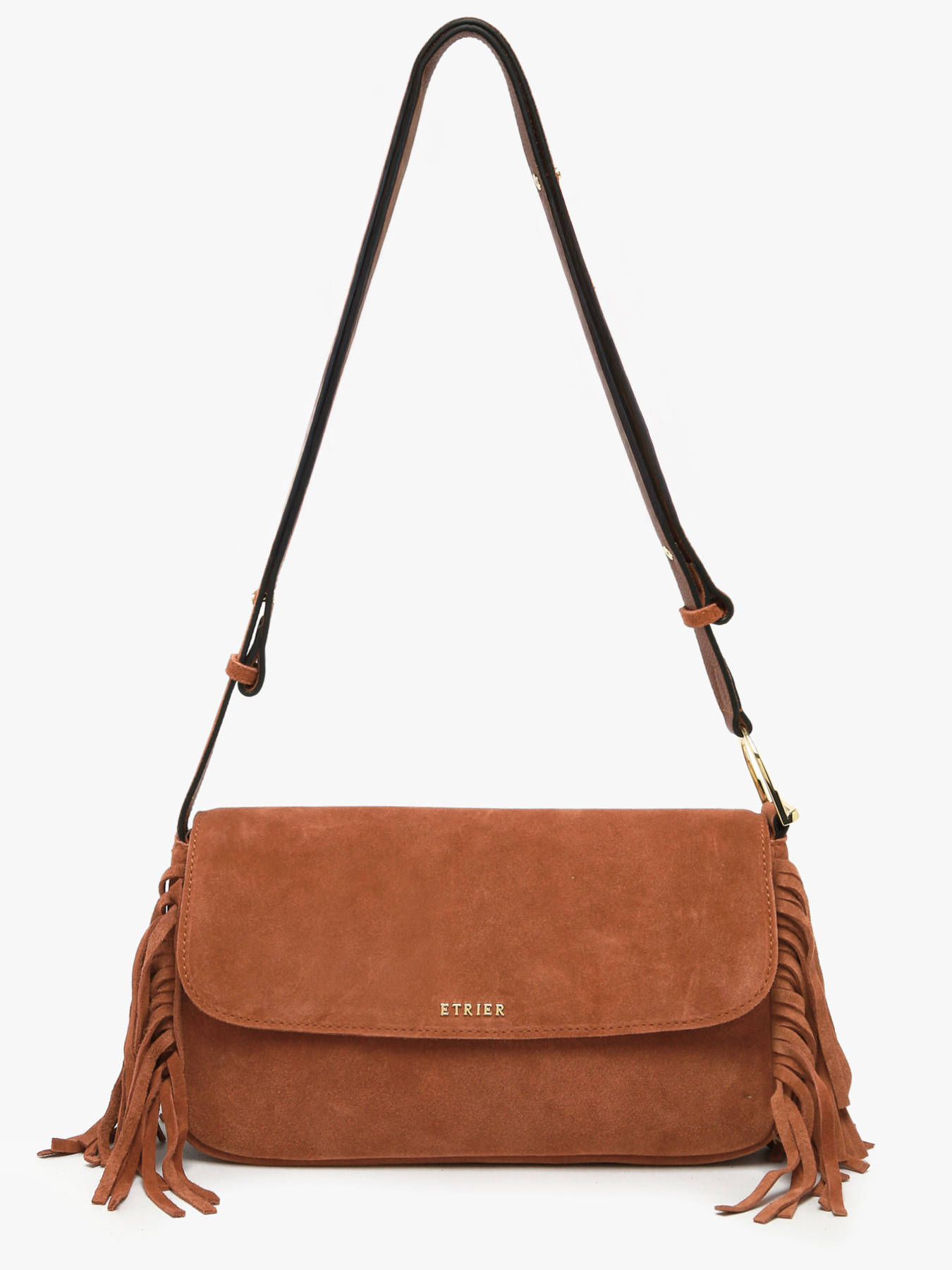 The ETRIER shoulder bag from the COUNTRY line charms with its iconic side fringes and strong bohemian spirit. This baguette-style bag in velvety leather closes with a magnetic flap, complemented by a zipper for added security. Its height-adjustable strap allows for shoulder wear or a shorter crossbody style, depending on your preference. The back of the bag is made of smooth leather for added structure and a refined finish. A stirrup-shaped charm elegantly decorates the side of the handle. With its authentic materials and natural movement, COUNTRY embodies the free and elegant spirit of winter.
