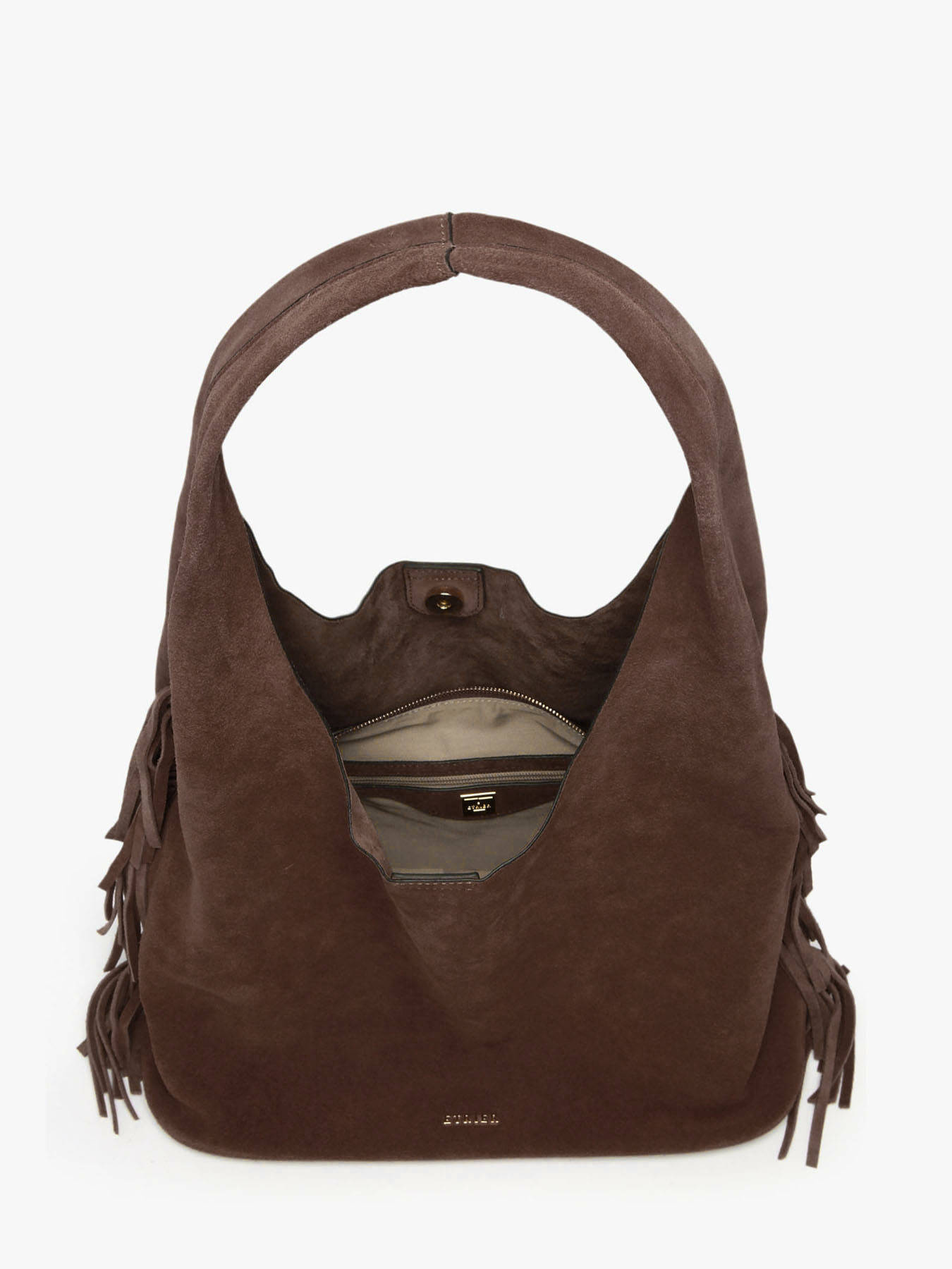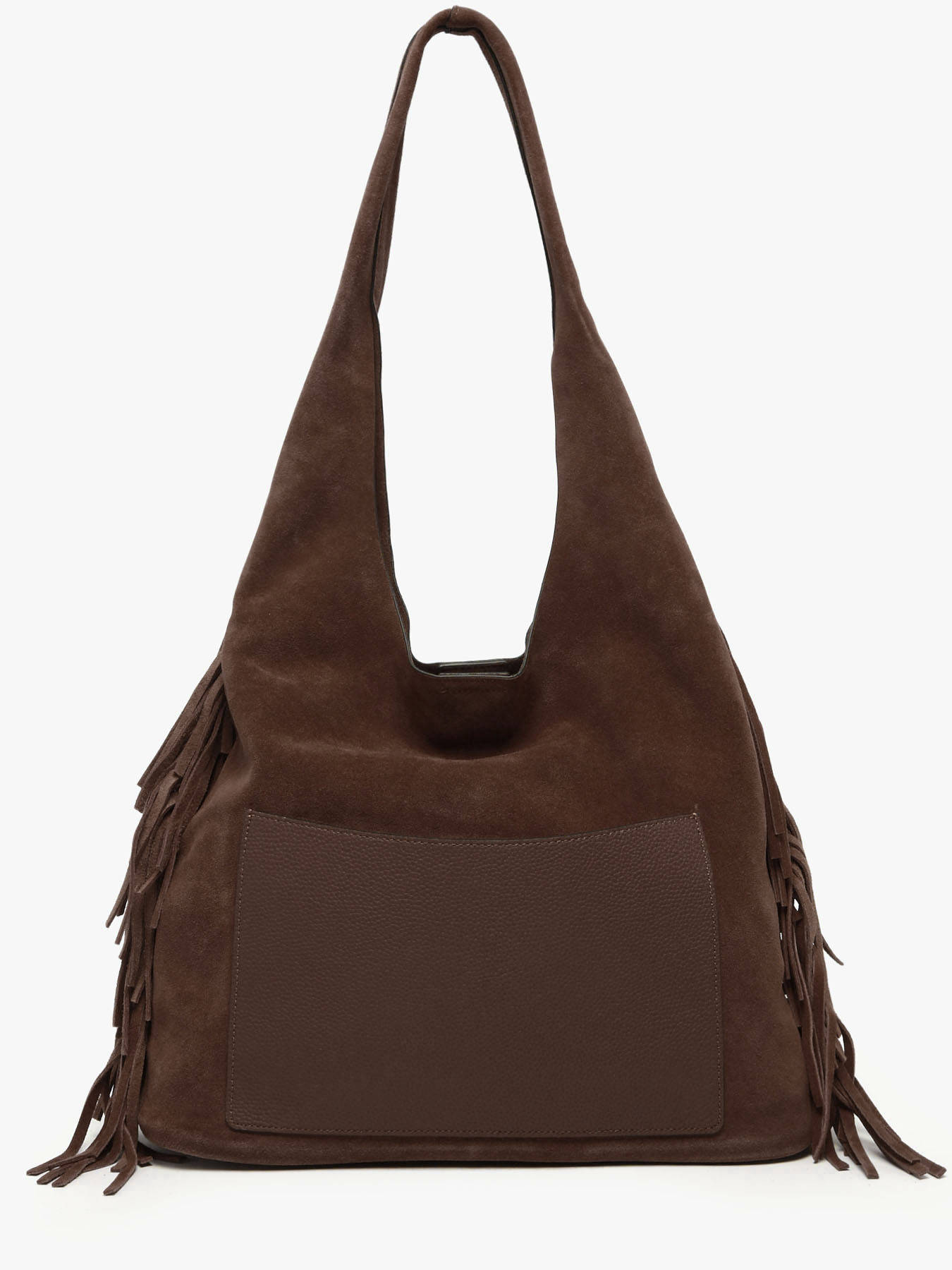 The ETRIER shoulder bag from the COUNTRY line is crafted from velvety leather. This hobo-style model, presented here in its large (L) size, stands out with its soft silhouette, iconic side fringes, and chic bohemian spirit. It closes with a magnetic snap. Inside, a removable pouch secures your personal belongings while adding structure. The back of the bag features a smooth leather slip pocket. With its generous size, this bag embodies a free and elegant style — ideal for winter, with authentic textures and natural movement.