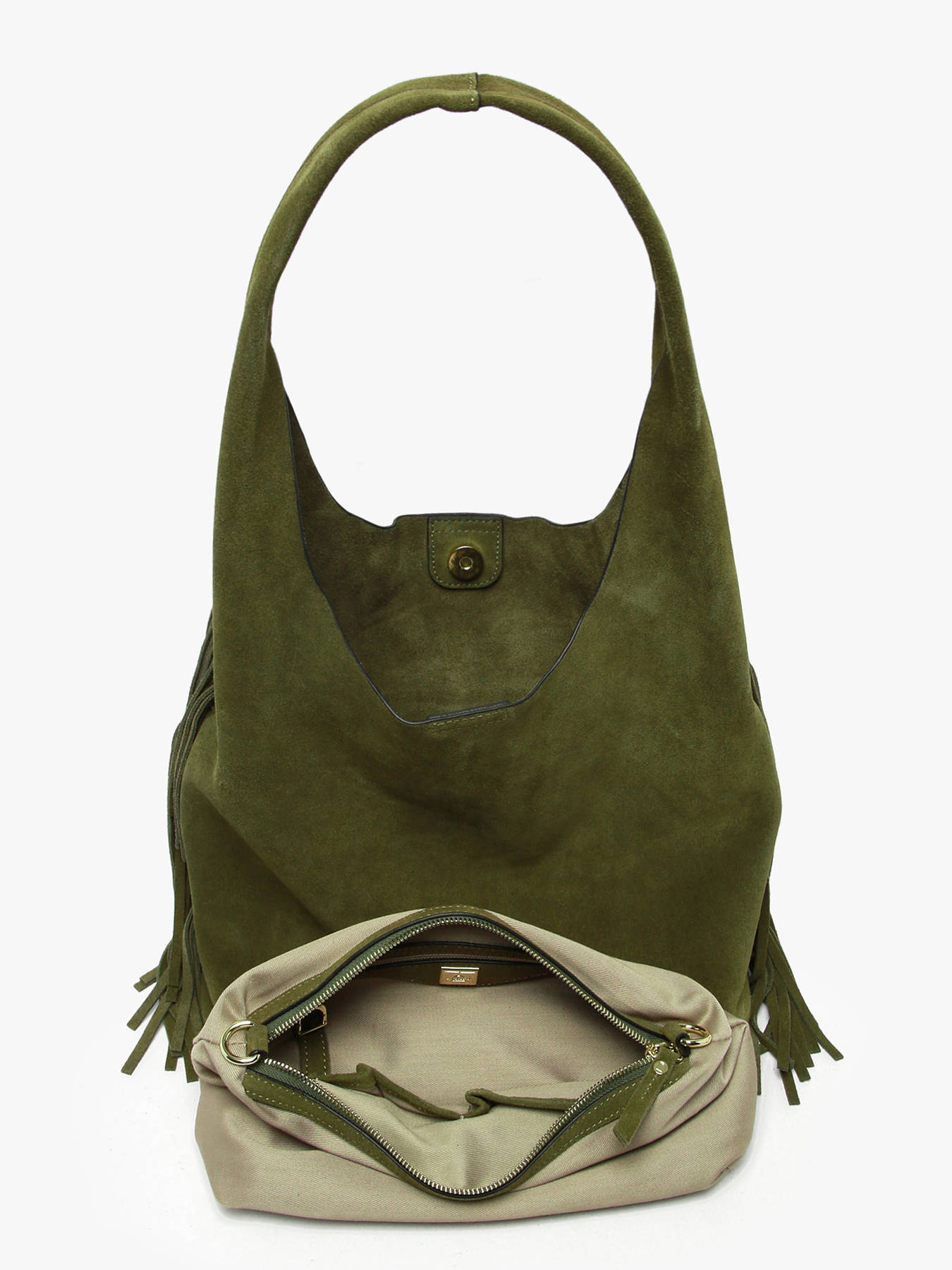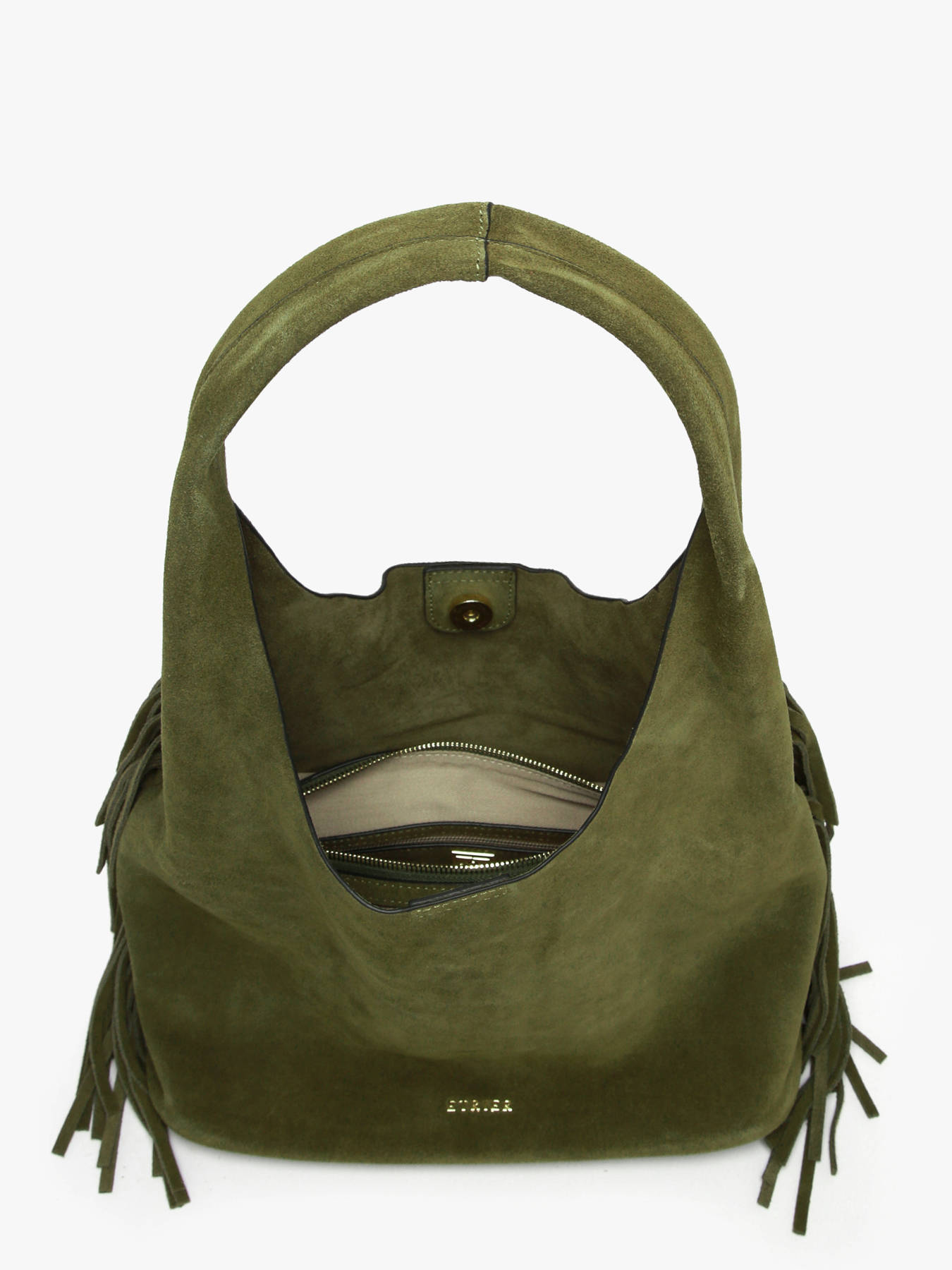 The ETRIER shoulder bag from the COUNTRY line is made of velvety leather. This small M-sized hobo silhouette stands out with its side fringes and bold bohemian style. It features a smooth leather slip pocket on the back. The bag closes with a magnetic snap. Inside, a removable pouch helps organize your essentials. This compact model embodies a free and elegant spirit — perfect for adding warmth, character, and authenticity to your winter outfits.